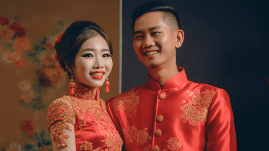 Traditional colours for a Chinese wedding include red, gold, and green. Red symbolizes love, joy, and prosperity, while gold signifies wealth. Green represents fertility and new life.